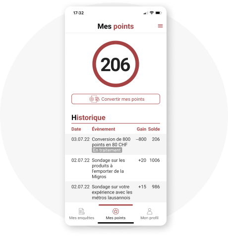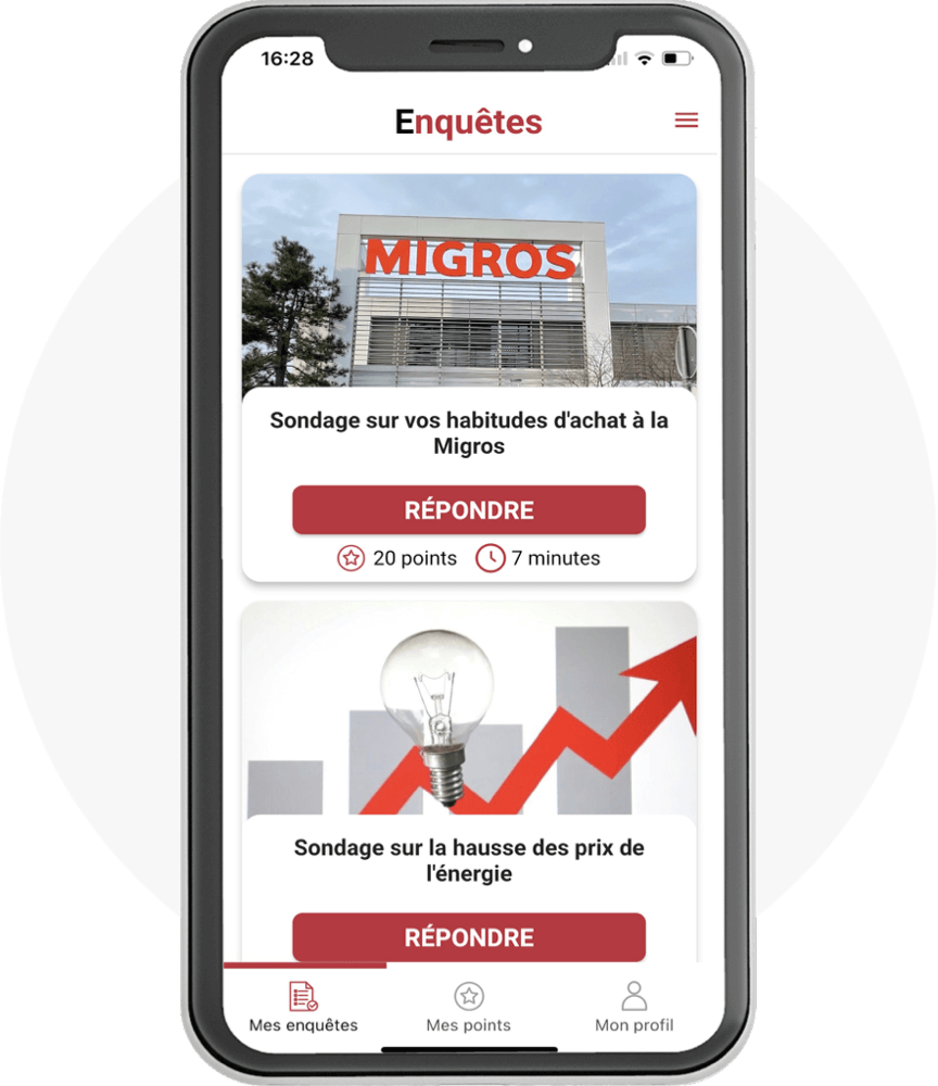 Nos sondages durent environ 5 minutes et sont récompensés en moyenne par 10 points = 1 franc. A partir de 100 points, vous pouvez demander à recevoir vos 10.- francs (paiement sur votre compte bancaire en Suisse).